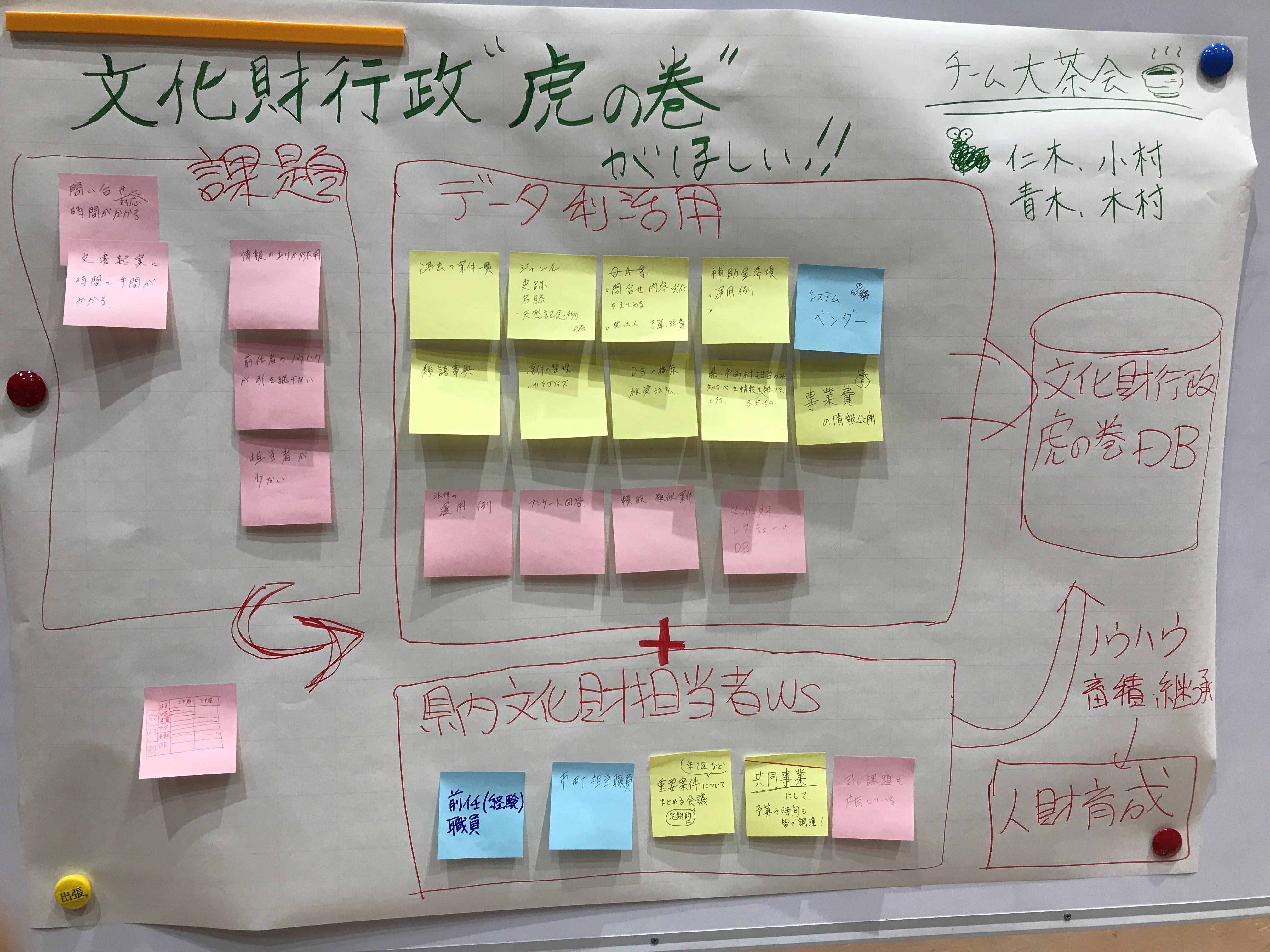 課題解決ワークショップにおいて、グループにわかれた参加者たちが作成した模造紙です。